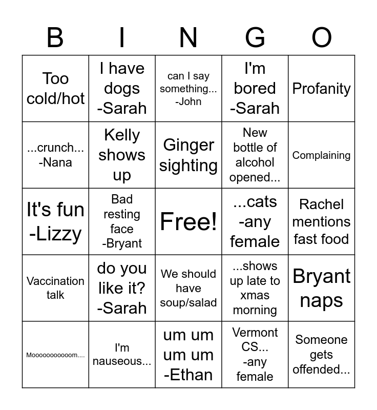 This bingo card has a free space and 24 words: do you like it? -Sarah, I'm nauseous..., Ginger sighting, Mooooooooooom...., Profanity, Too cold/hot, ...crunch... -Nana, I have dogs -Sarah, ...cats -any female, We should have soup/salad, New bottle of alcohol opened..., It's fun -Lizzy, ...shows up late to xmas morning, Bryant naps, Kelly shows up, Vermont CS... -any female, Rachel mentions fast food, can I say something... -John, Complaining, Bad resting face -Bryant, Someone gets offended..., Vaccination talk, I'm bored -Sarah and um um um um -Ethan.