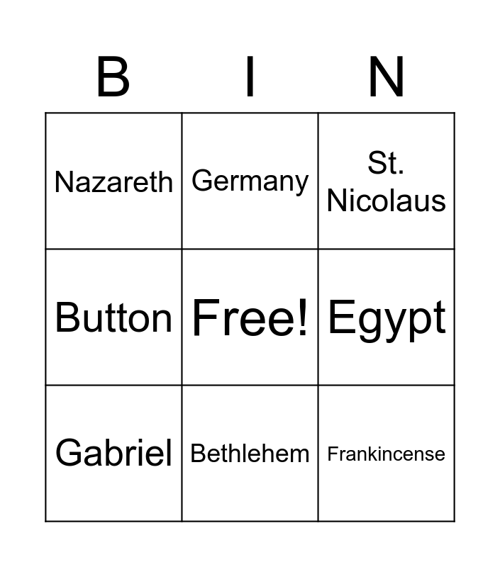 This bingo card has a free space and 10 words: Donkey, Bethlehem, St. Nicolaus, Nazareth, Egypt, Gabriel, Germany, Frankincense, Button and Germany.