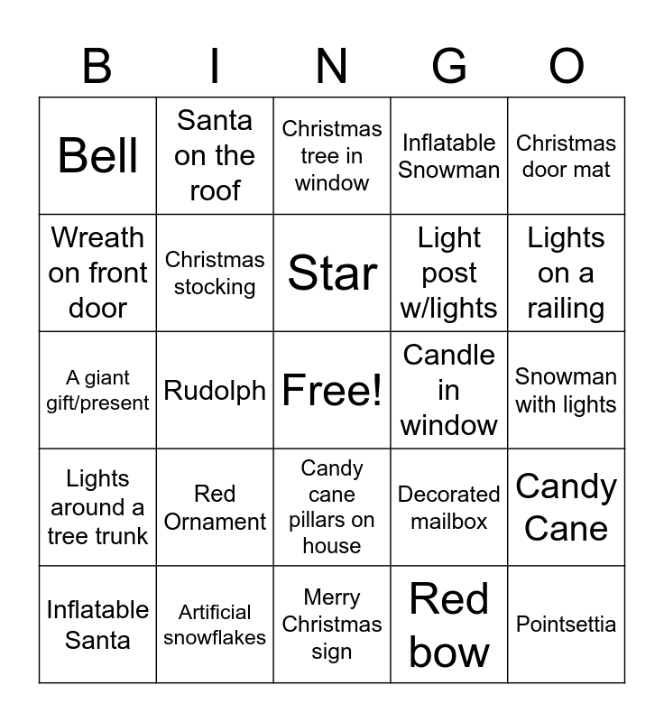 This bingo card has a free space and 27 words: Decorated mailbox, Multi colored lights on a house, Light post w/lights, Merry Christmas sign, Wreath on front door, Christmas tree in window, Santa on the roof, Lights around a tree trunk, Candle in window, Candy Cane, A giant gift/present, Inflatable Snowman, Inflatable Santa, Artificial snowflakes, Lights on a railing, House with only white lights, Christmas stocking, Star, Red Ornament, Bell, Snowman with lights, Red bow, Rudolph, Pointsettia, Candy cane pillars on house, Christmas door mat and Lighted Deer.
