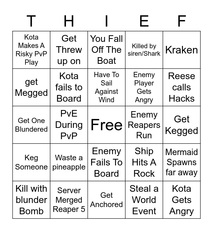 This bingo card has a free space and 24 words: Waste a pineapple, Server Merged Reaper 5, Have To Sail Against Wind, Kill with blunder Bomb, Kraken, Kota Makes A Risky PvP Play, get Megged, Get Threw up on, Enemy Reapers Run, Enemy Fails To Board, Enemy Player Gets Angry, Get One Blundered, Ship Hits A Rock, Mermaid Spawns far away, Kota fails to Board, Steal a World Event, Get Kegged, You Fall Off The Boat, Reese calls Hacks, PvE During PvP, Kota Gets Angry, Keg Someone, Killed by siren/Shark and Get Anchored.