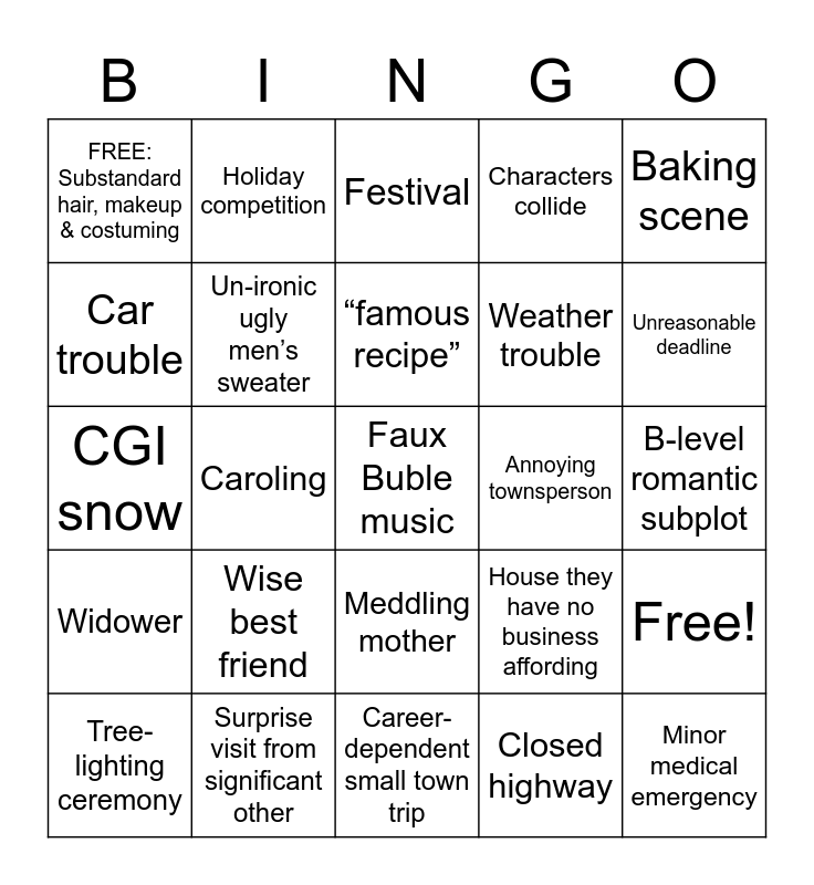 This bingo card has 28 words: Free!, Stupid scarf, Weather trouble, Closed highway, Car trouble, Festival, Holiday competition, Widower, Annoying townsperson, Tree-lighting ceremony, CGI snow, Characters collide, Surprise visit from significant other, Career-dependent small town trip, Unreasonable deadline, Family-run business, Wise best friend, Un-ironic ugly men’s sweater, “famous recipe”, Meddling mother, FREE: Substandard hair, makeup & costuming, Minor medical emergency, Faux Buble music, Caroling, B-level romantic subplot, House they have no business affording, Baking scene and Teeth.