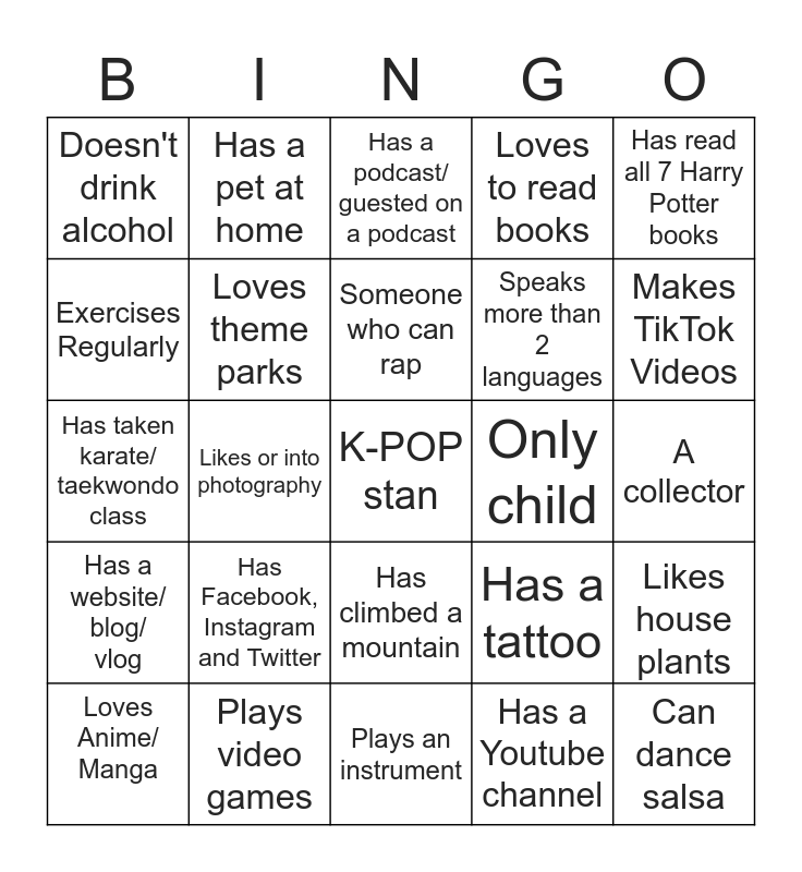 This bingo card has 28 words: Likes house plants, Can tell a joke, Speaks more than 2 languages, Has a Youtube channel, Exercises Regularly, Has a podcast/ guested on a podcast, Has a pet at home, Has a website/ blog/ vlog, Only child, Loves Anime/ Manga, Has taken karate/ taekwondo class, Loves to read books, Plays video games, Plays an instrument, Makes TikTok Videos, Invested in NFT, Has Facebook, Instagram and Twitter, Loves theme parks, Someone who can rap, Has climbed a mountain, Doesn't drink alcohol, Can dance salsa, K-POP stan, Likes or into photography, A collector, Has a tattoo, Has read all 7 Harry Potter books and Can do a tongue twister.
