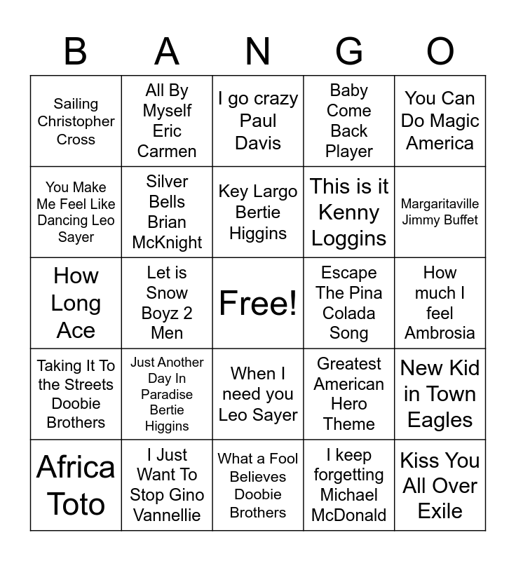 This bingo card has a free space and 55 words: I saw mommy kissing Santa Claus Jackson 5, Africa Toto, White Christmas Babyface, Sailing Christopher Cross, What a Fool Believes Doobie Brothers, Peg Steely Dan, Silver Bells Brian McKnight, I cant go for that Hall and Oates, This is it Kenny Loggins, Rudolph The Red Nosed Reindeer Temptations, Baby Come Back Player, Steel Away Robbie Dupree, I really love to see you tonight : England Dan Seals, Biggest Part of Me Ambrosia, Love Will Find a Way Pablo Cruise, Santa Baby Summer Walker, You Can Do Magic America, Let is Snow Boyz 2 Men, Just A Song Before I go Crosby Stills and Nash, Kiss You All Over Exile, Escape The Pina Colada Song, Your The One Seals and Crofts, Greatest American Hero Theme, I go crazy Paul Davis, Winter Wonderland, Key Largo Bertie Higgins, I keep forgetting Michael McDonald, Hey 19 Steely Dan, How much I feel Ambrosia, New Kid in Town Eagles, You are the Woman Firefall, Right Down The Line Gerry Rafferty, All I Want For Xmas is You Mariah Carrey, Ride Like the Wind Christopher Cross, You Make Me Feel Like Dancing Leo Sayer, How Long Ace, Rossana Toto, Taking It To the Streets Doobie Brothers, Jackie Blue Ozark MT Daredevils, Still The One Orleans, All By Myself Eric Carmen, Kiss On My List Hall and Oates, Dance With Me Orleans, Reminiscing Little River Band, Just Another Day In Paradise Bertie Higgins, I Just Want To Stop Gino Vannellie, I Cant Tell You Why Eagles, You are the Only Woman Ambrosia, Cool Change Little River Band, Margaritaville Jimmy Buffet, Spooky Atlanta Rhythm Section, Watcha Gonna Do? Pablo Cruise, Just remember I love you Firefall, When I need you Leo Sayer and Sharing The Night 2Gether Dr Hook.