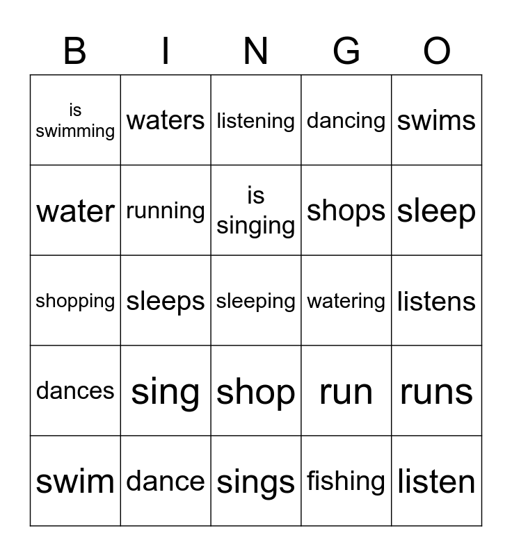 This bingo card has 25 words: sing, sings, is singing, swim, swims, is swimming, water, waters, watering, shop, shops, shopping, run, runs, running, listen, listens, listening, sleep, sleeps, sleeping, dance, dances, dancing and fishing.