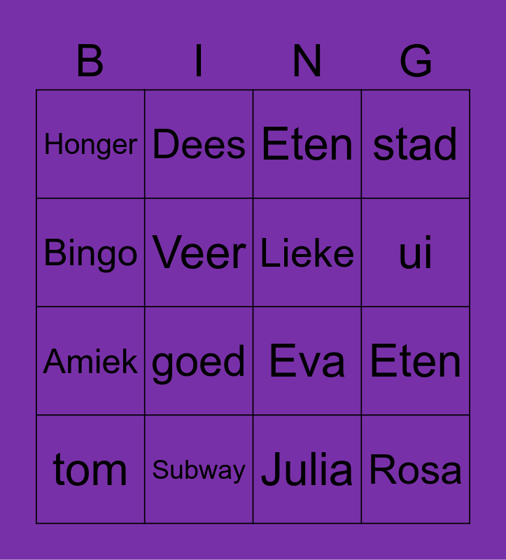 This bingo card has 30 words: Free!, Foodsy, Eten, Take away, Honger, Eten, Lieke, Demi, Subway, Lekbov, Julia, tom, ei, is, goed, Hoi, Doei, Rosa, Muziek, Bingo, Eva, GWen, Dees, Amiek, Veer, stad, dorp, winkel, ui and je.