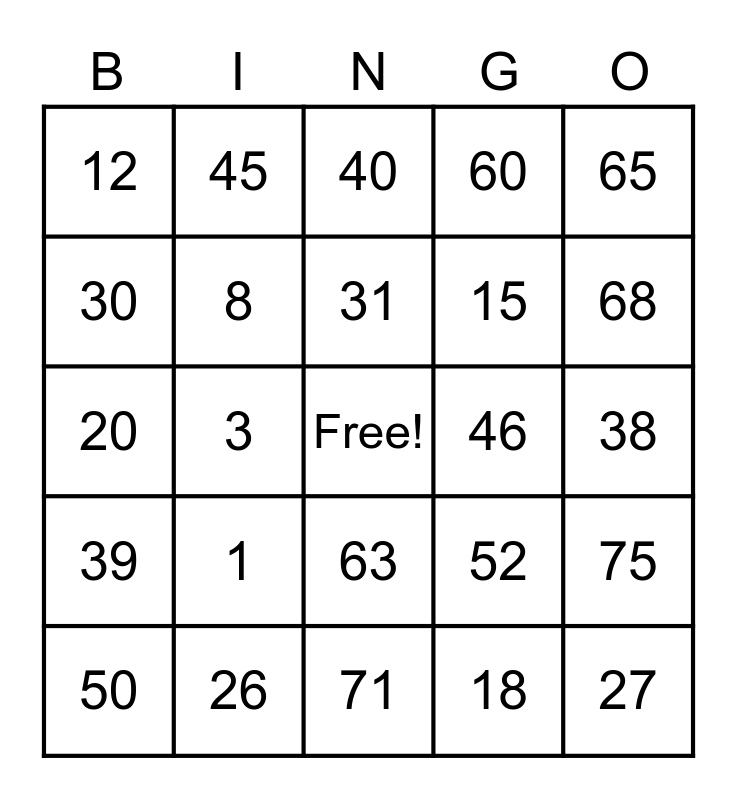 This bingo card has a free space and 24 words: 1, 26, 31, 50, 65, 12, 30, 45, 46, 63, 15, 20, 52, 75, 8, 18, 38, 40, 68, 3, 27, 39, 60 and 71.