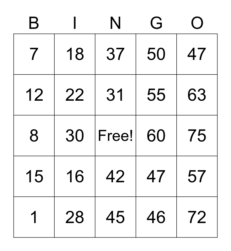 This bingo card has a free space and 24 words: 1, 16, 31, 46, 47, 7, 18, 37, 60, 75, 8, 22, 47, 57, 12, 28, 45, 50, 63, 15, 30, 42, 55 and 72.