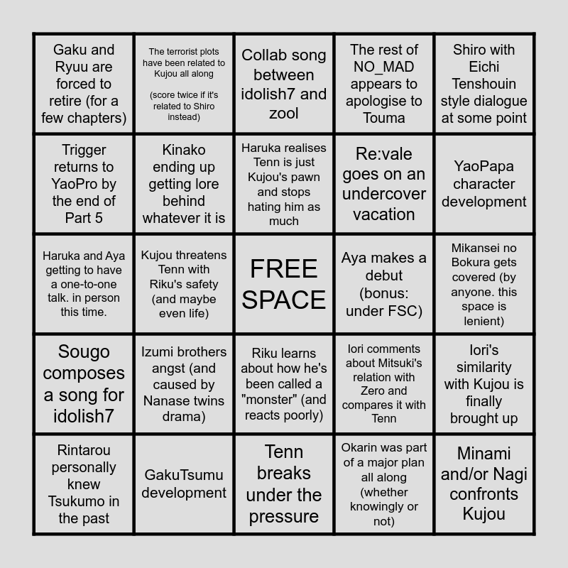This bingo card has a free space and 24 words: Izumi brothers angst (and caused by Nanase twins drama), GakuTsumu development, Haruka realises Tenn is just Kujou's pawn and stops hating him as much, Rintarou personally knew Tsukumo in the past, Shiro with Eichi Tenshouin style dialogue at some point, Gaku and Ryuu are forced to retire (for a few chapters), Trigger returns to YaoPro by the end of Part 5, The terrorist plots have been related to Kujou all along (score twice if it's related to Shiro instead), Aya makes a debut (bonus: under FSC), Riku learns about how he's been called a "monster" (and reacts poorly), Re:vale goes on an undercover vacation, Haruka and Aya getting to have a one-to-one talk. in person this time., Iori comments about Mitsuki's relation with Zero and compares it with Tenn, Iori's similarity with Kujou is finally brought up, Kinako ending up getting lore behind whatever it is, Okarin was part of a major plan all along (whether knowingly or not), Mikansei no Bokura gets covered (by anyone. this space is lenient), Collab song between idolish7 and zool, YaoPapa character development, Kujou threatens Tenn with Riku's safety (and maybe even life), Minami and/or Nagi confronts Kujou, Sougo composes a song for idolish7, The rest of NO_MAD appears to apologise to Touma and Tenn breaks under the pressure.
