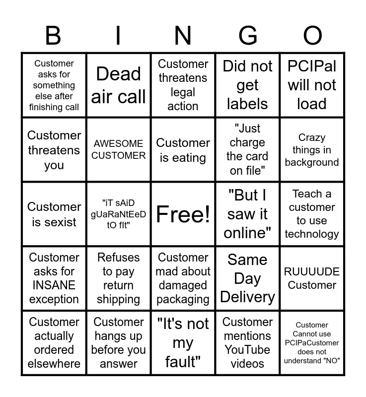 This bingo card has a free space and 82 words: Customer accuses us of being liars or scammers or sketchy, Arguing about tow mirrors, Customer threatens legal action, Customer asks for tech/mechanic, Customer asks for more info on part we do not carry, SYSTEM DOWN, Customer asks to tell you card number, "Can I text you a picture?", Cat steps on keyboard, Customer hung up, Customer asks for "total with tax", Customer asks for discount, AWESOME CUSTOMER, "But I saw it online", Signify Cancel, Customer asks for something else after finishing call, Customer actually ordered elsewhere, Customer threatens you, Customer curses you out, "I need to speak to a man", VPN issues, "Just charge the card on file", Customer Cannot use PCIPaCustomer does not understand "NO", PCIPal will not load, "iT sAiD gUaRaNtEeD tO fIt", "Clear Cache and Cookies", Told to watch your numbers, ManSplaining, Sketchy Customer, Customer doing something gross, Refuses to pay return shipping, We loose a customer, Customer is sexist, Customer cannot admit fault, "I ordered the right parts", "It's not my fault", Customer calls you a pet name, Multiple customer on call, Crazy things in background, Customer asks you to hold, Escalation, Did not get labels, Customer did NOT read listing, Customer flushes and does not wash hands, Someone calls about applying, Dead air call, Customer sniffs their boogies up, Customer is eating, Customer ordering food while on phone, Customer asking for someone else, Call longer than 10 minutes, Teach a customer to use technology, Customer hangs up before you answer, Customer talks over you or interrupts, Need more info, Callback DOESN'T answer, Customer needs to confirm with mechanic or someone else, Customer does NOT listen, "Can you see my cart?", Same Day Delivery, Mad about ESTIMATED delivery, "Are you married?", Customer asks for INSANE exception, Contact makes you late for break, Customer refuses to give vehicle info, Customer does not believe you, Customer refuses to do CDR, CIT/MAX gets glitchy, "I am a mechanic", Customer says they know what they are talking about but doesn't, Customer is lying, Customer hits on you, Customer mad about damaged packaging, Customer mentions YouTube videos, "You have a video for it", Tries to return order over a year old, "Is that both?", "Are bulbs included?", Customer threatens chargeback, Customer cuts you off or talks over you, RUUUUDE Customer and Callback - No Answer.