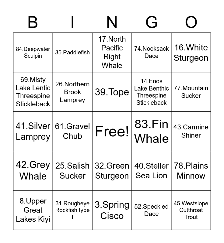 This bingo card has a free space and 93 words: 1.Unarmoured Threespine Stickleback, 2.Pugnose Minnow, 3.Spring Cisco, 4.Rocky Mountain Sculpin, 5.Northern Madtom, 6.Northern Wolffish, 7.Atlantic Walrus, 8.Upper Great Lakes Kiyi, 9.Vancouver Lamprey, 10.River Redhorse, 11.Basking Shark, 12.Silver Chub, 13.Channel Darter, 14.Enos Lake Benthic Threespine Stickleback, 15.Atlantic Wolffish, 16.White Sturgeon, 17.North Pacific Right Whale, 18.Humpback Whale, 19.Sei Whale, 20.Silver Shiner, 21.Rainbow Smelt, 22.Enos Lake Limnetic Threespine Stickleback, 23.Blackstripe Topminnow, 24.Bull Trout, 25.Salish Sucker, 26.Northern Brook Lamprey, 27.Black Redhorse, 28.North Atlantic Right Whale, 29.Yelloweye Rockfish, 30.Rainbow Trout, 31.Rougheye Rockfish type I, 32.Green Sturgeon, 33.Harbour Seal Lacs des Loups Marins subspecies, 34.Bridle Shiner, 35.Paddlefish, 36.Western Brook Lamprey, 37.White Shark, 38.Shortnose Sturgeon, 39.Tope, 40.Steller Sea Lion, 41.Silver Lamprey, 42.Grey Whale, 43.Carmine Shiner, 44.Sea Otter, 45.Westslope Cutthroat Trout, 46.Eastern Sand Darter, 47.Rougheye Rockfish type II, 48.Misty Lake Lotic Threespine Stickleback, 49.Harbour Porpoise, 50.Northern Sunfish, 51.Striped Bass, 52.Speckled Dace, 53.Redside Dace, 54.Copper Redhorse, 55.Bowhead Whale, 56.Shorthead Sculpin, 57.Atlantic Salmon, 58.Lake Chubsucker, 59.Paxton Lake Limnetic Threespine Stickleback, 60.Northern Bottlenose Whale, 61.Gravel Chub, 62.Paxton Lake Benthic Threespine Stickleback, 63.Sowerby's Beaked Whale, 64.Coastrange Sculpin, 65.Spotted Gar, 66.Vananda Creek Limnetic Threespine Stickleback, 67.Blue Whale, 68.Longspine Thornyhead, 69.Misty Lake Lentic Threespine Stickleback, 70.Shortnose Cisco, 71.Bigmouth Buffalo, 72.Atlantic Whitefish, 73.Western Silvery Minnow, 74.Nooksack Dace, 75.Vananda Creek Benthic Threespine Stickleback, 76.Grass Pickerel, 77.Mountain Sucker, 78.Plains Minnow, 79.Beluga Whale, 80.Dolly Varden, 81.Columbia Sculpin, 82.Giant Threespine Stickleback, 83.Fin Whale, 84.Deepwater Sculpin, 85.Cutlip Minnow, 86.Bluntnose Sixgill Shark, 87.Lake Sturgeon, 88.Killer Whale, 89.Spotted Sucker, 90.Banded Killifish, 91.Warmouth, 92.Spotted Wolffish and 93.Pugnose Shiner.