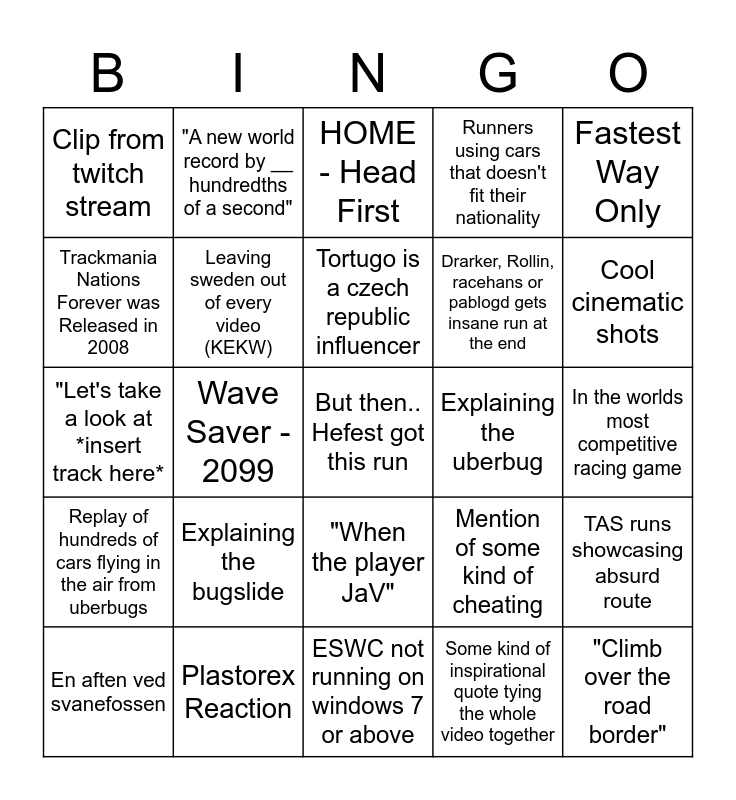 This bingo card has a free space and 24 words: Explaining the bugslide, Plastorex Reaction, Tortugo is a czech republic influencer, En aften ved svanefossen, Fastest Way Only, Clip from twitch stream, Trackmania Nations Forever was Released in 2008, "A new world record by __ hundredths of a second", Explaining the uberbug, "When the player JaV", Drarker, Rollin, racehans or pablogd gets insane run at the end, "Let's take a look at *insert track here*, Mention of some kind of cheating, TAS runs showcasing absurd route, Leaving sweden out of every video (KEKW), Some kind of inspirational quote tying the whole video together, In the worlds most competitive racing game, HOME - Head First, Cool cinematic shots, Wave Saver - 2099, "Climb over the road border", Replay of hundreds of cars flying in the air from uberbugs, Runners using cars that doesn't fit their nationality and ESWC not running on windows 7 or above.