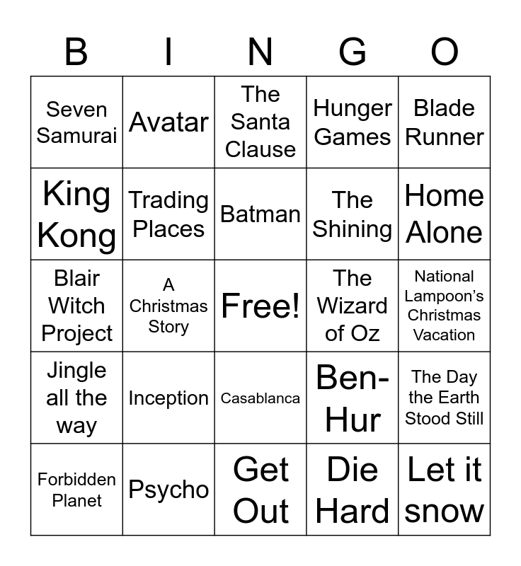 This bingo card has a free space and 24 words: Inception, Psycho, Batman, Forbidden Planet, Blade Runner, Seven Samurai, King Kong, Avatar, The Wizard of Oz, Casablanca, The Shining, Blair Witch Project, Ben-Hur, The Day the Earth Stood Still, Trading Places, Die Hard, National Lampoon’s Christmas Vacation, The Santa Clause, Home Alone, A Christmas Story, Let it snow, Jingle all the way, Hunger Games and Get Out.