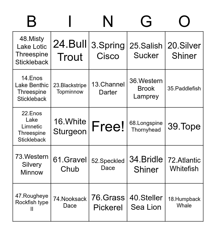 This bingo card has a free space and 77 words: 1.Unarmoured Threespine Stickleback, 2.Pugnose Minnow, 3.Spring Cisco, 4.Rocky Mountain Sculpin, 5.Northern Madtom, 6.Northern Wolffish, 7.Atlantic Walrus, 8.Upper Great Lakes Kiyi, 9.Vancouver Lamprey, 10.River Redhorse, 11.Basking Shark, 12.Silver Chub, 13.Channel Darter, 14.Enos Lake Benthic Threespine Stickleback, 15.Atlantic Wolffish, 16.White Sturgeon, 17.North Pacific Right Whale, 18.Humpback Whale, 19.Sei Whale, 20.Silver Shiner, 21.Rainbow Smelt, 22.Enos Lake Limnetic Threespine Stickleback, 23.Blackstripe Topminnow, 24.Bull Trout, 25.Salish Sucker, 26.Northern Brook Lamprey, 27.Black Redhorse, 28.North Atlantic Right Whale, 29.Yelloweye Rockfish, 30.Rainbow Trout, 31.Rougheye Rockfish type I, 32.Green Sturgeon, 33.Harbour Seal Lacs des Loups Marins subspecies, 34.Bridle Shiner, 35.Paddlefish, 36.Western Brook Lamprey, 37.White Shark, 38.Shortnose Sturgeon, 39.Tope, 40.Steller Sea Lion, 41.Silver Lamprey, 42.Grey Whale, 43.Carmine Shiner, 44.Sea Otter, 45.Westslope Cutthroat Trout, 46.Eastern Sand Darter, 47.Rougheye Rockfish type II, 48.Misty Lake Lotic Threespine Stickleback, 49.Harbour Porpoise, 50.Northern Sunfish, 51.Striped Bass, 52.Speckled Dace, 53.Redside Dace, 54.Copper Redhorse, 55.Bowhead Whale, 56.Shorthead Sculpin, 57.Atlantic Salmon, 58.Lake Chubsucker, 59.Paxton Lake Limnetic Threespine Stickleback, 60.Northern Bottlenose Whale, 61.Gravel Chub, 62.Paxton Lake Benthic Threespine Stickleback, 63.Sowerby's Beaked Whale, 64.Coastrange Sculpin, 65.Spotted Gar, 66.Vananda Creek Limnetic Threespine Stickleback, 67.Blue Whale, 68.Longspine Thornyhead, 69.Misty Lake Lentic Threespine Stickleback, 70.Shortnose Cisco, 71.Bigmouth Buffalo, 72.Atlantic Whitefish, 73.Western Silvery Minnow, 74.Nooksack Dace, 75.Vananda Creek Benthic Threespine Stickleback, 76.Grass Pickerel and 77.Mountain Sucker.