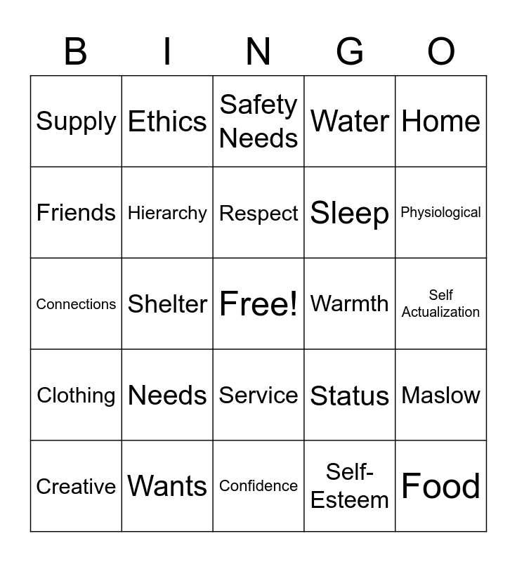 This bingo card has a free space and 24 words: Needs, Wants, Respect, Creative, Home, Supply, Friends, Ethics, Warmth, Service, Sleep, Connections, Status, Maslow, Hierarchy, Self-Esteem, Self Actualization, Safety Needs, Physiological, Shelter, Food, Clothing, Water and Confidence.
