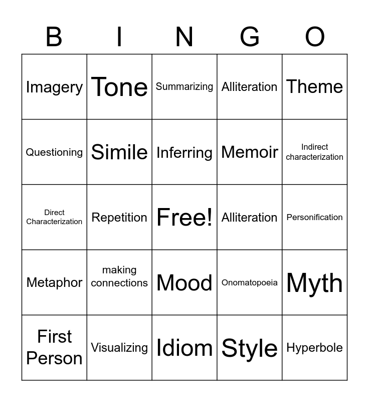 This bingo card has a free space and 24 words: making connections, Visualizing, Inferring, First Person, Theme, Imagery, Questioning, Tone, Alliteration, Mood, Memoir, Direct Characterization, Onomatopoeia, Myth, Simile, Style, Personification, Summarizing, Indirect characterization, Repetition, Hyperbole, Metaphor, Alliteration and Idiom.