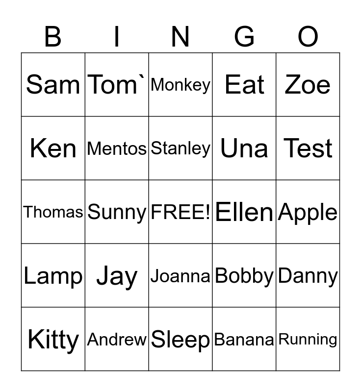 This bingo card has a free space and 24 words: Jay, Andrew, Stanley, Kitty, Zoe, Sam, Ken, Tom`, Ellen, Joanna, Una, Thomas, Bobby, Danny, Mentos, Banana, Apple, Monkey, Test, Sunny, Running, Lamp, Eat and Sleep.