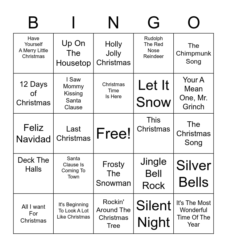 This bingo card has a free space and 24 words: Santa Clause Is Coming To Town, It's Beginning To Look A Lot Like Christmas, Christmas Time Is Here, All I want For Christmas, The Chimpmunk Song, Have Yourself A Merry Little Christmas, 12 Days of Christmas, Up On The Housetop, This Christmas, Frosty The Snowman, Let It Snow, Feliz Navidad, Jingle Bell Rock, Silver Bells, I Saw Mommy Kissing Santa Clause, Silent Night, The Christmas Song, Holly Jolly Christmas, Your A Mean One, Mr. Grinch, Last Christmas, It's The Most Wonderful Time Of The Year, Deck The Halls, Rudolph The Red Nose Reindeer and Rockin' Around The Christmas Tree.