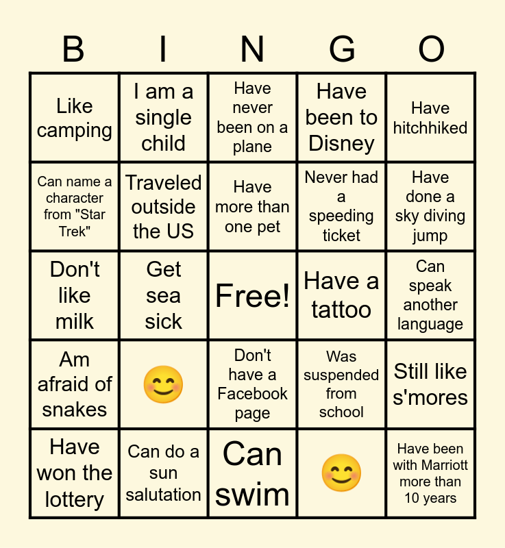 This bingo card has a free space and 24 words: 😊, Can do a sun salutation, Have more than one pet, Have won the lottery, Have hitchhiked, Like camping, Can name a character from "Star Trek", I am a single child, Have a tattoo, Don't have a Facebook page, Never had a speeding ticket, Don't like milk, Was suspended from school, Still like s'mores, Traveled outside the US, 😊, Can speak another language, Have never been on a plane, Have done a sky diving jump, Get sea sick, Have been with Marriott more than 10 years, Am afraid of snakes, Have been to Disney and Can swim.