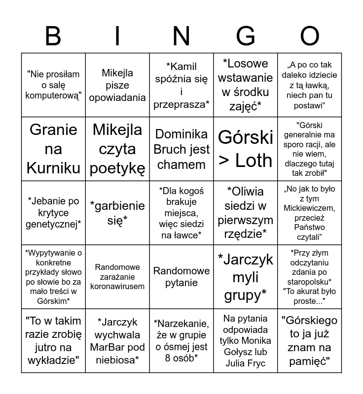 This bingo card has a free space and 24 words: Randomowe zarażanie koronawirusem, *Jarczyk wychwala MarBar pod niebiosa*, Dominika Bruch jest chamem, "To w takim razie zrobię jutro na wykładzie", „A po co tak daleko idziecie z tą ławką, niech pan tu postawi”, "Nie prosiłam o salę komputerową", Granie na Kurniku, Mikejla pisze opowiadania, *Oliwia siedzi w pierwszym rzędzie*, Randomowe pytanie, Górski > Loth, *Jebanie po krytyce genetycznej*, *Jarczyk myli grupy*, *Przy złym odczytaniu zdania po staropolsku* "To akurat było proste...", Mikejla czyta poetykę, Na pytania odpowiada tylko Monika Gołysz lub Julia Fryc, „No jak to było z tym Mickiewiczem, przecież Państwo czytali”, *Kamil spóźnia się i przeprasza*, "Górski generalnie ma sporo racji, ale nie wiem, dlaczego tutaj tak zrobił", *garbienie się*, "Górskiego to ja już znam na pamięć", *Wypytywanie o konkretne przykłady słowo po słowie bo za mało treści w Górskim*, *Losowe wstawanie w środku zajęć* and *Narzekanie, że w grupie o ósmej jest 8 osób*.