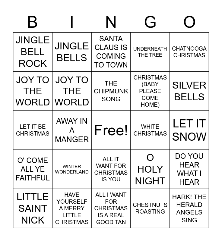 This bingo card has a free space and 24 words: LITTLE SAINT NICK, WINTER WONDERLAND, THE CHIPMUNK SONG, CHESTNUTS ROASTING, CHATNOOGA CHRISTMAS, JINGLE BELL ROCK, JINGLE BELLS, SANTA CLAUS IS COMING TO TOWN, WHITE CHRISTMAS, LET IT SNOW, LET IT BE CHRISTMAS, JOY TO THE WORLD, O HOLY NIGHT, DO YOU HEAR WHAT I HEAR, JOY TO THE WORLD, HAVE YOURSELF A MERRY LITTLE CHRISTMAS, ALL I WANT FOR CHRISTMAS IS A REAL GOOD TAN, UNDERNEATH THE TREE, SILVER BELLS, O' COME ALL YE FAITHFUL, AWAY IN A MANGER, ALL IT WANT FOR CHRISTMAS IS YOU, CHRISTMAS (BABY PLEASE COME HOME) and HARK! THE HERALD ANGELS SING.