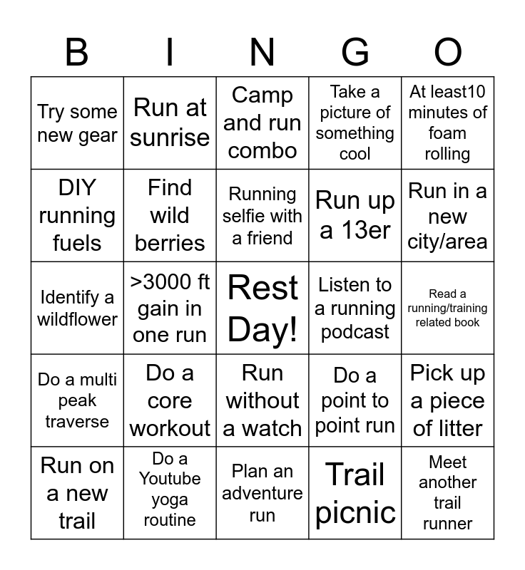 This bingo card has a free space and 24 words: Do a core workout, Do a Youtube yoga routine, Running selfie with a friend, Run on a new trail, At least10 minutes of foam rolling, Try some new gear, DIY running fuels, Run at sunrise, Listen to a running podcast, Run without a watch, Run up a 13er, Identify a wildflower, Do a point to point run, Pick up a piece of litter, Find wild berries, Trail picnic, Read a running/training related book, Camp and run combo, Run in a new city/area, >3000 ft gain in one run, Meet another trail runner, Do a multi peak traverse, Take a picture of something cool and Plan an adventure run.