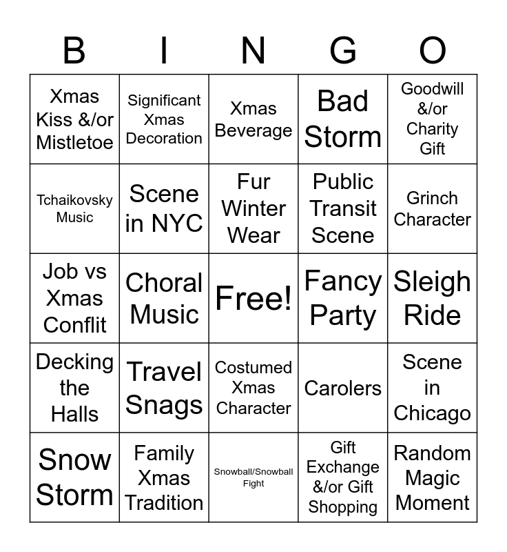 This bingo card has a free space and 24 words: Travel Snags, Family Xmas Tradition, Fur Winter Wear, Snow Storm, Goodwill &/or Charity Gift, Xmas Kiss &/or Mistletoe, Tchaikovsky Music, Significant Xmas Decoration, Fancy Party, Costumed Xmas Character, Public Transit Scene, Job vs Xmas Conflit, Carolers, Scene in Chicago, Scene in NYC, Gift Exchange &/or Gift Shopping, Sleigh Ride, Xmas Beverage, Grinch Character, Choral Music, Random Magic Moment, Decking the Halls, Bad Storm and Snowball/Snowball Fight.