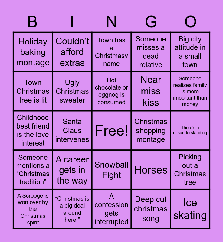 This bingo card has a free space and 38 words: Bad ADR, Main character does something clumsy, Awkward product placement, Ugly Christmas sweater, Picking out a Christmas tree, A career gets in the way, Hot chocolate or eggnog is consumed, Mistletoe, Big city attitude in a small town, Near miss kiss, Santa Claus intervenes, Someone misses a dead relative, Ice skating, There’s a misunderstanding, Town Christmas tree is lit, Someone mentions a “Christmas tradition”, Fake Christmas trees are not acceptable, Town has a Christmasy name, Main character has a Christmasy name, Christmas shopping montage, Holiday baking montage, “Christmas is a big deal around here.”, Someone realizes family is more important than money, A Scrooge is won over by the Christmas spirit, There’s a meddling relative or friend, A confession gets interrupted, Town Event in Jeopardy, Love interest does something threatening, This could be a horror movie, Drunk Relative, Queer baiting, Snowball Fight, Deep cut christmas song, Couldn’t afford extras, Precocious child, Horses, Childhood best friend is the love interest and Weirdly religious.