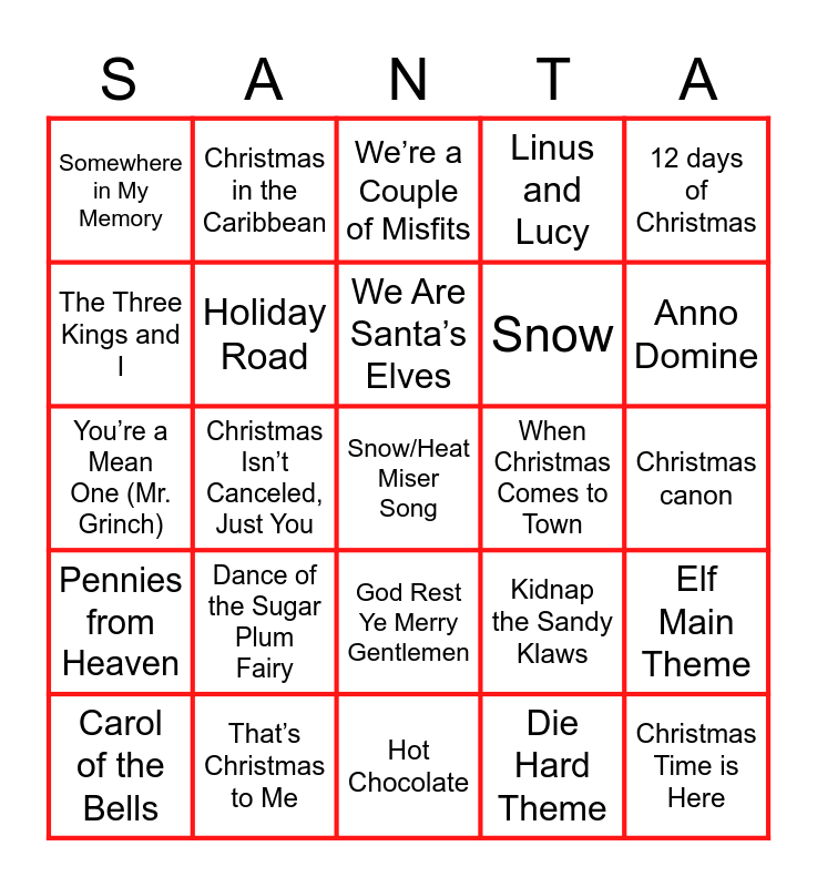 This bingo card has 32 words: Carol of the Bells, The Mandalorian Theme, Snow/Heat Miser Song, Appalachian Snowfall, Christmas canon, The Three Kings and I, Holiday Road, Hot Chocolate, Snow, Christmas Eve Sarejevo, You’re a Mean One (Mr. Grinch), Christmas in the Caribbean, Underneath the Tree, Die Hard Theme, Anno Domine, Do They Know it’s Christmas?, That’s Christmas to Me, We Are Santa’s Elves, When Christmas Comes to Town, Elf Main Theme, Pennies from Heaven, What’s This?, God Rest Ye Merry Gentlemen, Kidnap the Sandy Klaws, 12 days of Christmas, Somewhere in My Memory, Christmas Isn’t Canceled, Just You, We’re a Couple of Misfits, Linus and Lucy, Christmas Time is Here, Glow and Dance of the Sugar Plum Fairy.