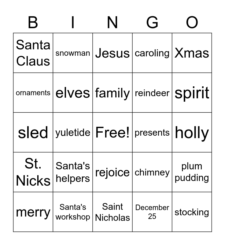 This bingo card has a free space and 57 words: Christmas, merry, festive, Santa Claus, Saint Nicholas, Kris Kringle, elves, jolly, reindeer, carols, caroling, carolers, mistletoe, frankincense, myrrh, nativity, Xmas, yuletide, tinsel, stocking, presents, fruitcake, chimney, Jesus, birth, family, candy, pinecone, spirit, tidings, tradition, Rudolph, sleigh, holiday, holly, ornaments, Scrooge, sled, snowball, St. Nicks, snowman, rejoice, Father Christmas, Christmas Eve, Christmas tree, Jack Frost, Santa's helpers, Santa's workshop, Christmas carol, Christmas card, Frosty the Snowman, December 25, sleigh bells, gingerbread house, North Pole, plum pudding and season's greetings.