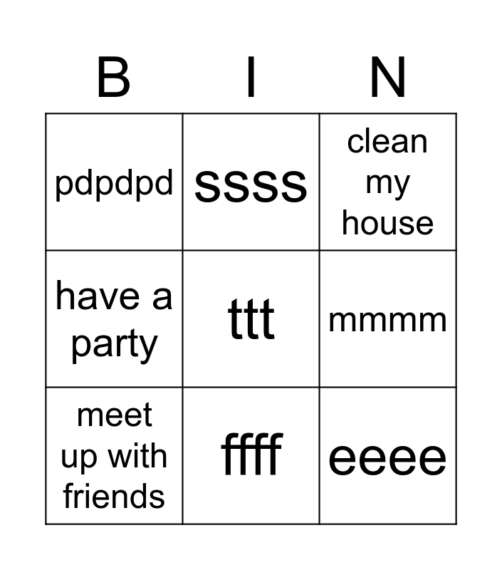 This bingo card has 9 words: meet up with friends, clean my house, ssss, have a party, pdpdpd, mmmm, ttt, eeee and ffff.