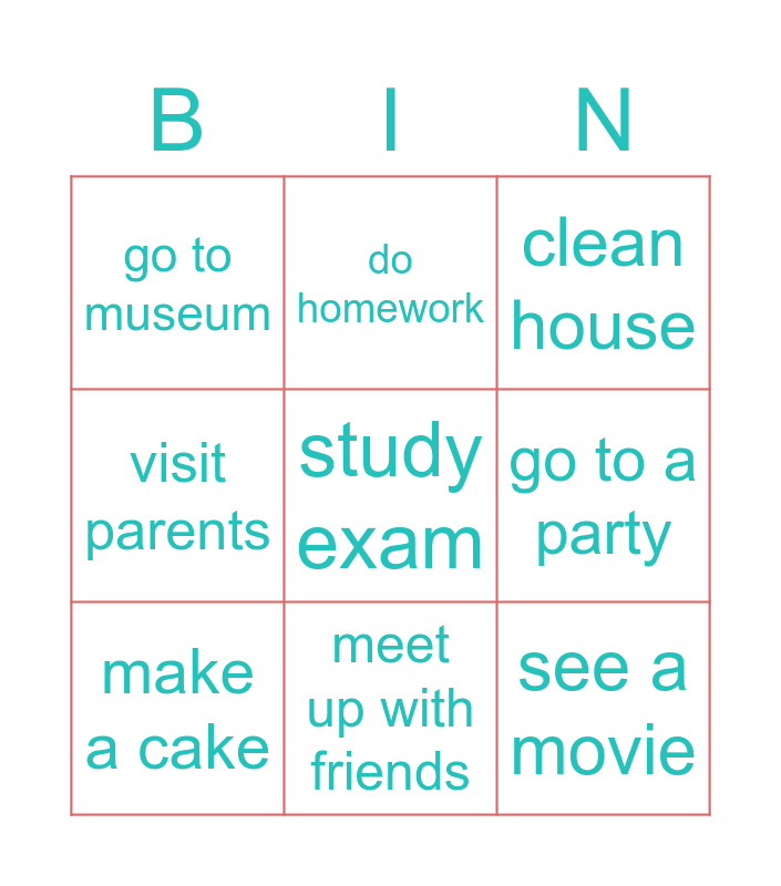 This bingo card has a free space and 8 words: go to a party, clean house, do homework, make a cake, go to museum, see a movie, visit parents and meet up with friends.