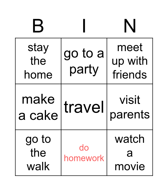 This bingo card has a free space and 8 words: visit parents, meet up with friends, go to a party, go to the walk, stay the home, watch a movie, make a cake and do homework.