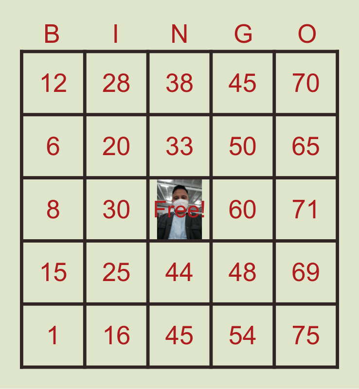 This bingo card has a free space and 24 words: 1, 25, 33, 54, 70, 12, 28, 38, 60, 71, 8, 20, 48, 69, 6, 16, 45, 45, 65, 15, 30, 44, 50 and 75.