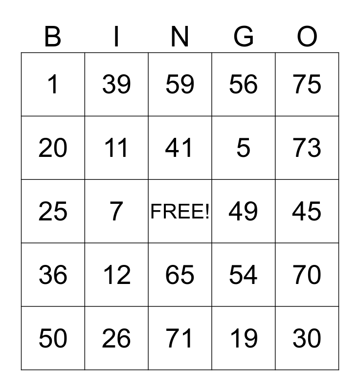 This bingo card has a free space and 24 words: 12, 26, 41, 50, 75, 1, 20, 39, 49, 65, 5, 25, 54, 70, 11, 19, 45, 59, 73, 7, 30, 36, 56 and 71.