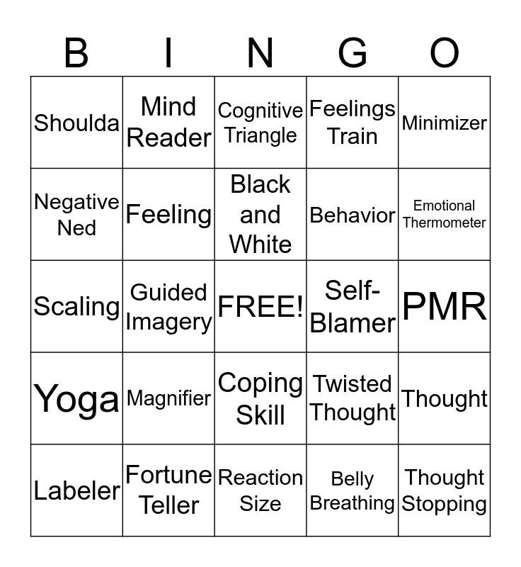 This bingo card has a free space and 24 words: Magnifier, Fortune Teller, Black and White, Labeler, Minimizer, Shoulda, Negative Ned, Mind Reader, Self-Blamer, Coping Skill, Behavior, Scaling, Twisted Thought, Thought, Feeling, Belly Breathing, PMR, Cognitive Triangle, Emotional Thermometer, Guided Imagery, Thought Stopping, Yoga, Feelings Train and Reaction Size.