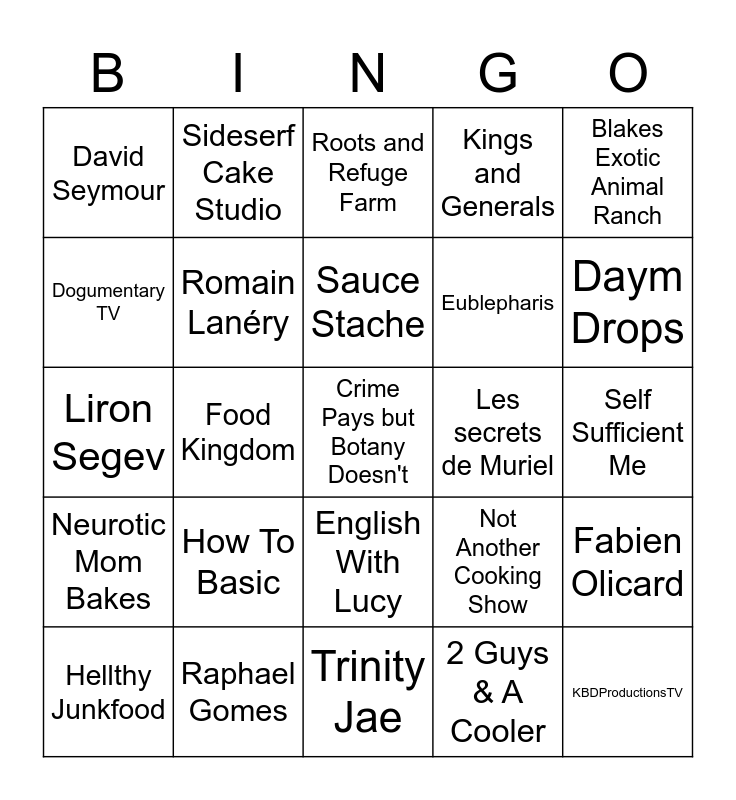 This bingo card has 104 words: Free!, Smokin' and Grillin' wit AB, Blakes Exotic Animal Ranch, Nela Zisser, Nick Bingo, Indigo Traveller, OfficialDuckStudios, Leopard Gecko, Hamiltonville Farm, Marlene Mc'Cohen, Rockstar Eater, Myrtle Beach Safari, Ericsurf6, Enes Yilmazer, Keto Twins, Paul Cuffaro, Roots and Refuge Farm, Sow the Land, Mr. Puzzle, Shelby Church, Cheap Lazy Vegan, SankeyMagic, Smoky Ribs BBQ, Simply Mama Cooks, Freakin' Reviews, How To Basic, Daym Drops, Kings and Generals, Zoes Fancy Cakes, Dating Beyond Borders, Not Another Cooking Show, 2 Guys & A Cooler, Kinging- It, Abbie Cakes, CupOfTJ, ChadWithaJ, Yellow Productions, Georgia's Cakes, Sauce Stache, Raphael Gomes, Cupcake Savvy Kitchen, Neurotic Mom Bakes, Origins Explained, Dogumentary TV, Eamon and Bec, David Seymour, Wes Barker, Crime Pays but Botany Doesn't, The King of Random, KBDProductionsTV, Glen & Friends Cooking, Kara & Nate, Josh Elkin, White House On The Hill, Honeysuckle, Brian Barczyk, CHEFPK, The Chef Dumas, The Perfect Home (Il Rifugio Perfetto), English With Lucy, Self Sufficient Me, Hiroyuki Terada - Diaries of a Master Sushi Chef, TheTravelingClatt, This Esme, StarTalk, Slivki Show, Retired Working For You, Sideserf Cake Studio, Liron Segev, Food Kingdom, Trinity Jae, Cody Buffinton, Gold Shaw Farm, Vincenzo's Plate, Barry Lewis, Mrwhosetheboss, Prince Ea, Hellthy Junkfood, Emmymade, Chris Ramsay, The Action Lab, Il était une fois la pâtisserie, Romain Lanéry, Quelle Recette, Les secrets de Muriel, Tous en Cuisine avec Seb, Le Barbecue de Rafa, Le Riz Jaune, Chocmiel, Chef Michel Dumas, Notabene, Trash, FlorianOnAir, Fabien Olicard, Ahmed Lndy, Food is Love, Pierr Cika, Eublepharis, Gregsway, Alan food challenge, Alexandre Calvez, Pi-wan, Morgan VS and Frédéric Jean.