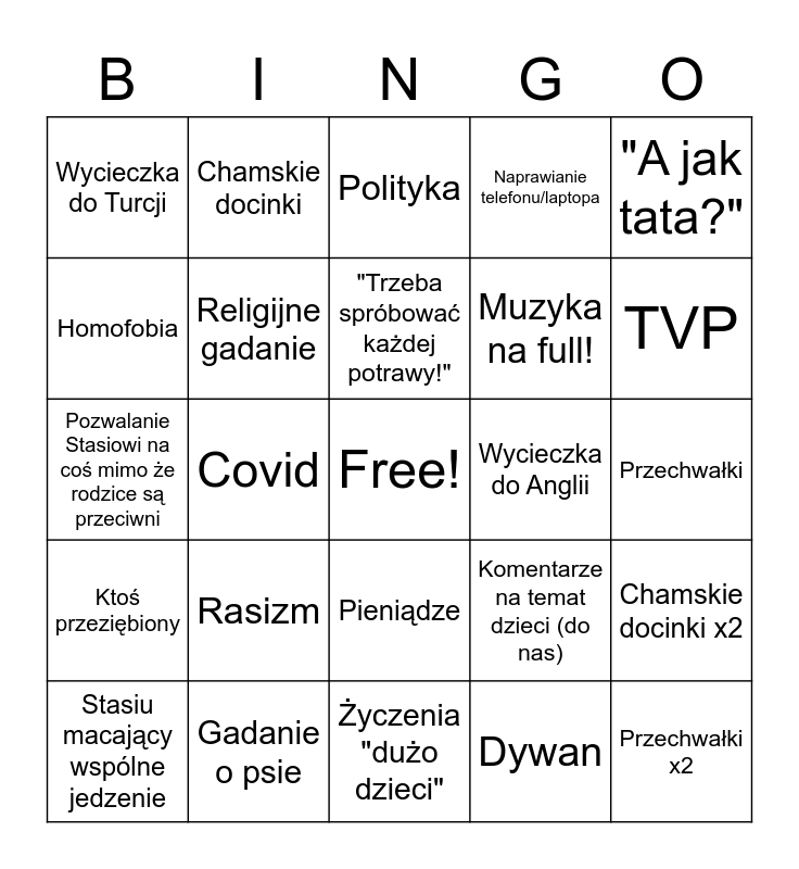 This bingo card has a free space and 24 words: Rasizm, Gadanie o psie, "Trzeba spróbować każdej potrawy!", Stasiu macający wspólne jedzenie, "A jak tata?", Wycieczka do Turcji, Homofobia, Chamskie docinki, Wycieczka do Anglii, Pieniądze, Muzyka na full!, Pozwalanie Stasiowi na coś mimo że rodzice są przeciwni, Komentarze na temat dzieci (do nas), Chamskie docinki x2, Religijne gadanie, Dywan, Przechwałki, Polityka, TVP, Covid, Przechwałki x2, Ktoś przeziębiony, Naprawianie telefonu/laptopa and Życzenia "dużo dzieci".