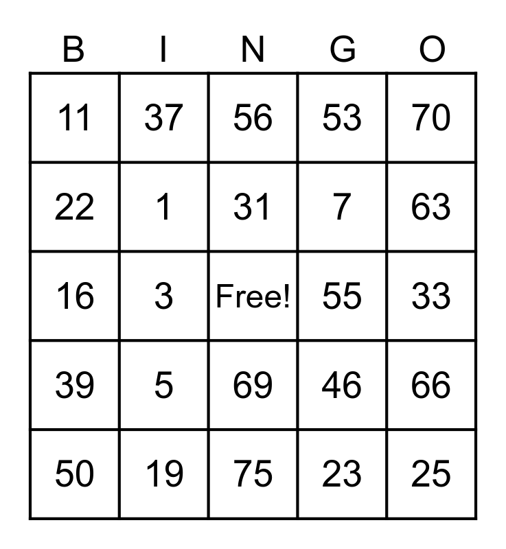 This bingo card has a free space and 24 words: 5, 19, 31, 50, 70, 11, 22, 37, 55, 69, 7, 16, 46, 66, 1, 23, 33, 56, 63, 3, 25, 39, 53 and 75.