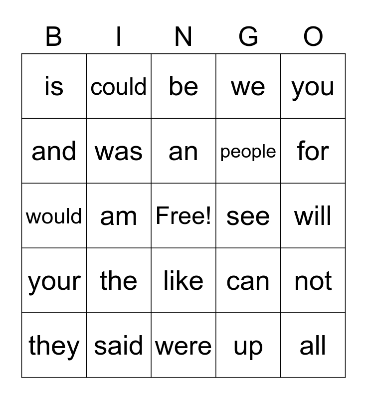 This bingo card has a free space and 24 words: the, said, an, they, you, is, and, could, see, like, people, would, can, not, was, up, will, be, for, am, all, your, we and were.