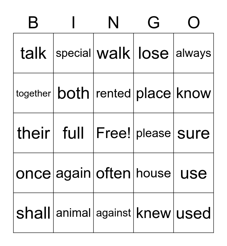 This bingo card has a free space and 29 words: shall, both, full, pull, talk, walk, both, again, please, animal, sure, used, against, knew, know, always, often, once, always, their, house, right, place, together, lose, special, use, rented and piece.