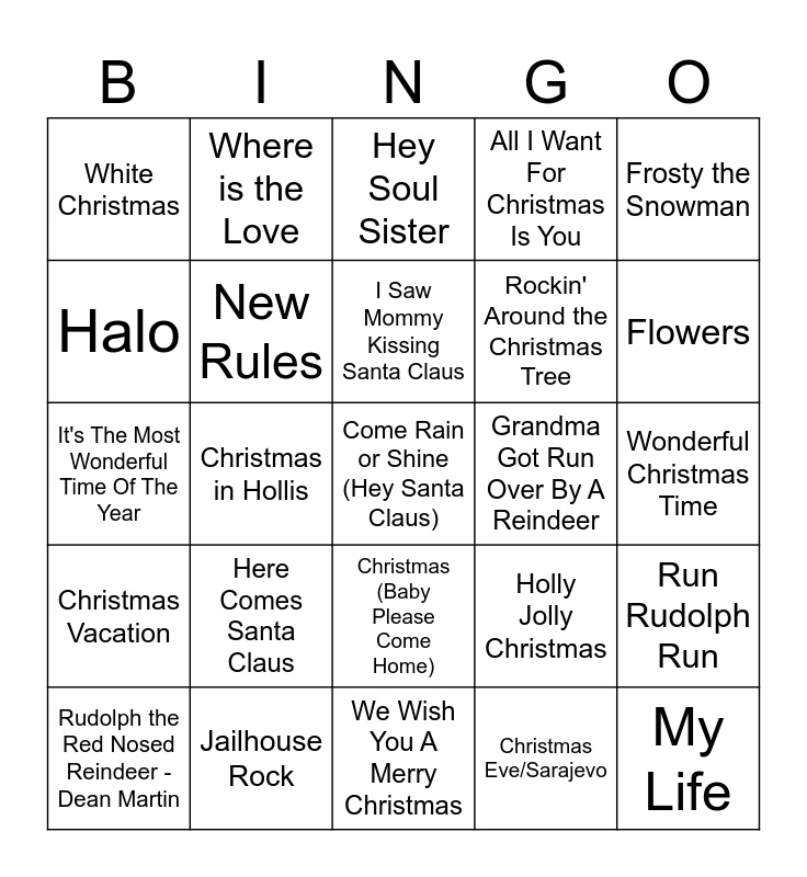 This bingo card has 64 words: Back Door Santa, Mistress for Christmas, Little Saint Nick, Run Rudolph Run, Santa Claus is Coming To Town - Frank Sinatra & Cindi Lauper, Merry Christmas Baby, Where is the Love, Jingle Bell Rock - Hall & Oates, I Saw Mommy Kissing Santa Claus, Abracadabra, Christmas (Baby Please Come Home), Santa Claus is Coming to Town - Bruce Springsteen, Wonderful Christmas Time, Frosty the Snowman, Walking on Sunshine, Halo, Christmas in Hollis, White Christmas, Valerie, Rockin' Around the Christmas Tree, Here Comes Santa Claus, Christmas Vacation, All I Want For Christmas Is You, Shotgun, Feliz Navidad, Jingle Bell Rock - Bobbie Helms, Last Christmas, Mele Kalikimaka, Santa Baby - Eartha Kitt, Sleigh Ride - Ella Fitzgerald, Holiday, It's Beginning to Look alot Like Christmas - Michael Buble, Hold My Hand, You're A Mean One, Mr. Grinch, Flowers, Rudolph the Red Nosed Reindeer - Dean Martin, Merry Christmas Everyone, Christmas Eve/Sarajevo, Baby It's Cold Outside, New Rules, It's The Most Wonderful Time Of The Year, Grandma Got Run Over By A Reindeer, Sleigh Ride - Harry Connick, It Must Have Been 'Ol Santa Claus, Bad Day, Come Rain or Shine (Hey Santa Claus), Jailhouse Rock, My Life, Holly Jolly Christmas, Love Shack, Please Come Home for Christmas, Complicated, We Wish You A Merry Christmas, Santa Tell Me, Inside Out, Big Yellow Taxi, Hey Soul Sister, I Believe in a Thing Called Love, Santa Can't You Hear Me, Officially Christmas, Stretchy Pants, The Sweet Escape, Dancing in the Moonlight and 'Zat You Santa Claus?.