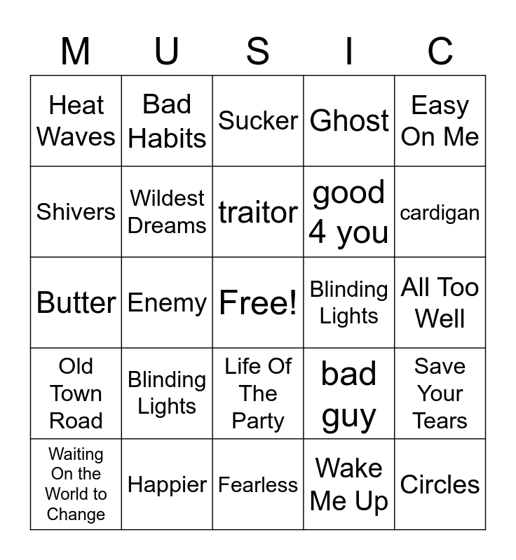 This bingo card has a free space and 26 words: Life Of The Party, Wake Me Up, traitor, Happier, Easy On Me, Heat Waves, Shivers, Bad Habits, All Too Well, bad guy, good 4 you, Butter, Save Your Tears, Waiting On the World to Change, Enemy, My Universe, Ghost, Old Town Road, Sucker, Circles, cardigan, Fearless, Blinding Lights, Blinding Lights, Wildest Dreams and Someday.