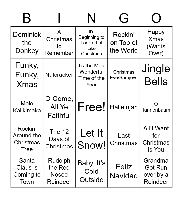 This bingo card has a free space and 26 words: Let It Snow!, Feliz Navidad, It’s the Most Wonderful Time of the Year, Rudolph the Red Nosed Reindeer, Happy Xmas (War is Over), Dominick the Donkey, Funky, Funky, Xmas, A Christmas to Remember, O Tannenbaum, Last Christmas, Christmas Eve/Sarajevo, Mele Kalikimaka, All I Want for Christmas is You, Santa Claus is Coming to Town, O Come, All Ye Faithful, Hark! The Herald Angels Sing, Rockin’ on Top of the World, Rockin’ Around the Christmas Tree, It’s Beginning to Look a Lot Like Christmas, Grandma Got Run over by a Reindeer, Jingle Bells, Baby, It’s Cold Outside, Hallelujah, The 12 Days of Christmas, Nutcracker and The Chanukah Song.