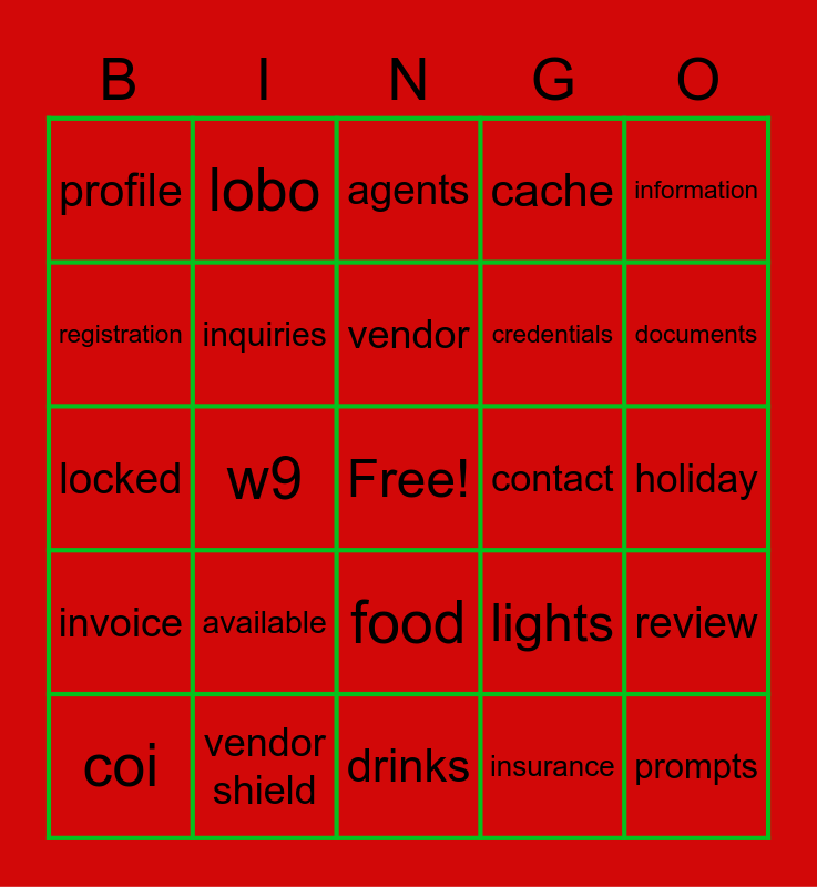 This bingo card has a free space and 59 words: team fun, vendor shield, vendor cafe, invoice, insurance, dashboard, inquiries, client central, credentials, google chrome, cache, cookies, registration, compliance, account, profile, prompts, information, management, vendor, contact, agents, coi, review, submit, interaction, properties, eft, documents, liability, workmans comp, escalation, optimizer, market, lobo, inactive, payment, w9, status, locked, client, available, holiday, decorations, star, reindeer, presents, tree, food, drinks, snow, vacation, travel, sparkle, garland, lights, peace, family and friends.