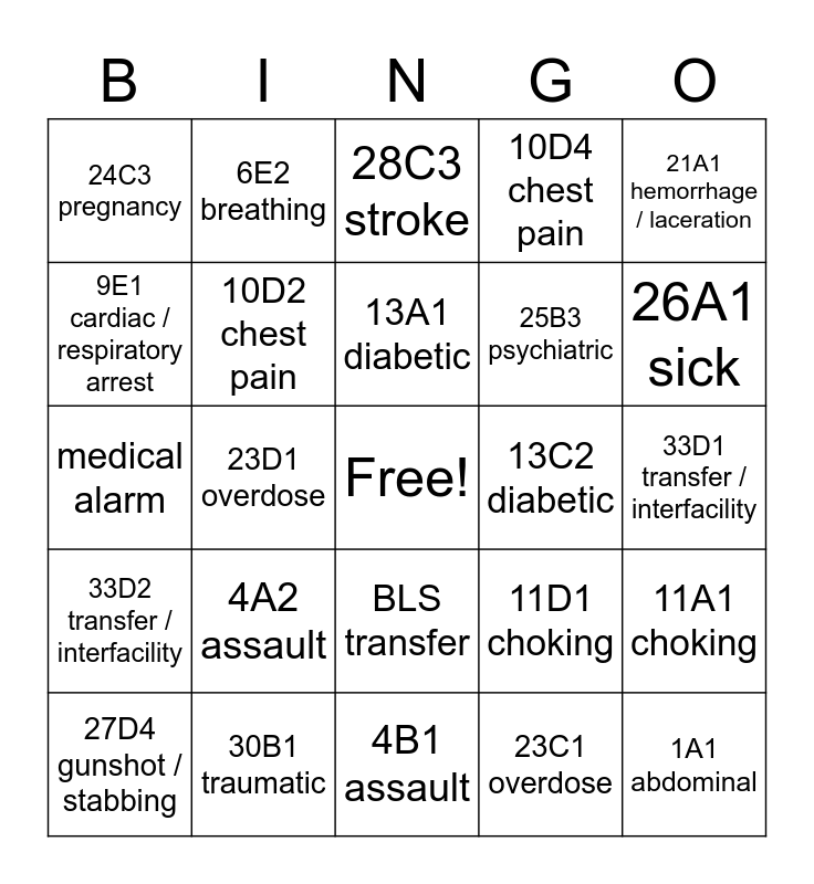 This bingo card has a free space and 51 words: 1D1 abdominal, 1A1 abdominal, 2D2 allergies, 4B1 assault, 4A2 assault, 5A1 back pain, 6E2 breathing, 6D4 breathing, 9E1 cardiac / respiratory arrest, 9D1 cardiac / respiratory arrest, 10D2 chest pain, 10D4 chest pain, 11A1 choking, 11D1 choking, 12A1 seizure, 12C3 seizure, 13A1 diabetic, 13C2 diabetic, 21B1 hemorrhage / laceration, 21A1 hemorrhage / laceration, 23D1 overdose, 23C1 overdose, 24C3 pregnancy, 25B3 psychiatric, 25A1 psychiatric, 25A2 psychiatric, 26A1 sick, 27B2 gunshot / stabbing, 27D4 gunshot / stabbing, 28C3 stroke, 28A11 stroke, 29B1 traffic, 29B5 traffic, 29A2 traffic, 30A2 traumatic, 30B1 traumatic, 31D2 unconscious, 31A3 unconscious, 32B3 unknown, 32D1 unknown, 33D1 transfer / interfacility, 33D2 transfer / interfacility, 33A1 transfer / interfacility, 33A2 transfer / interfacility, take a call for a client, take an SCT, medical alarm, talk to field supervisor, flight transfer, BLS transfer and ALS transfer.