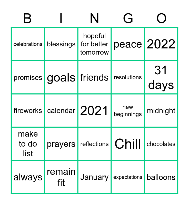 This bingo card has a free space and 24 words: prayers, remain fit, friends, always, 2022, celebrations, promises, blessings, new beginnings, reflections, resolutions, fireworks, Chill, chocolates, goals, expectations, midnight, hopeful for better tomorrow, 31 days, calendar, balloons, make to do list, peace and January.