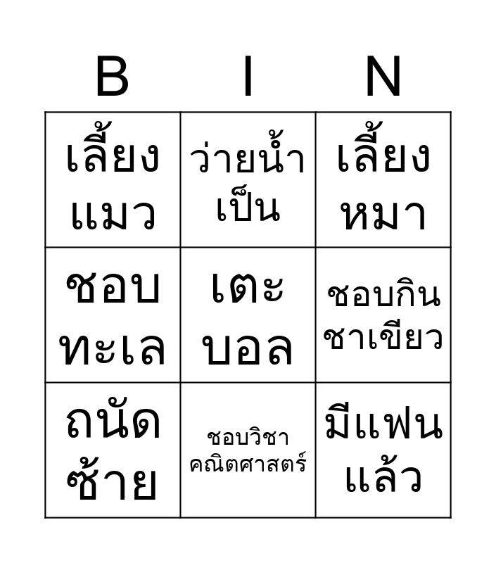 This bingo card has 17 words: Free!, ชอบสีฟ้า, เลี้ยงหมา, เลี้ยงแมว, มีพี่ชาย, ชอบทะเล, ชอบภูเขา, ถนัดซ้าย, ชอบวิชาคณิตศาสตร์, ชอบกินชาเขียว, เกิดวันจันทร์, ชอบสีชมพู, เตะบอล, ว่ายน้ำเป็น, มีแฟนแล้ว, เล่นtiktok and โสด.