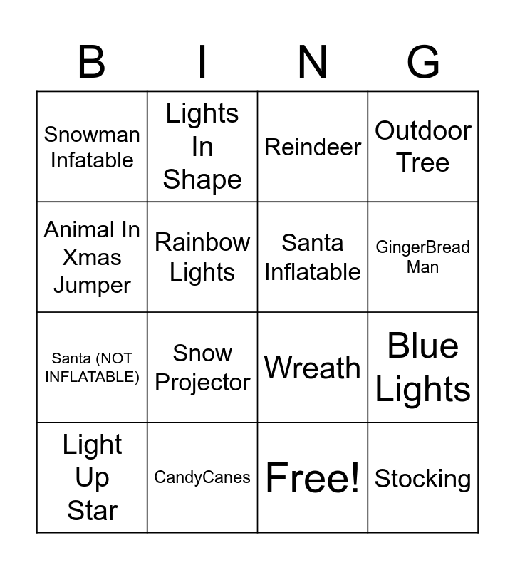 This bingo card has 17 words: Free!, Light Up Star, Reindeer, Snowman Infatable, Snow Projector, Outdoor Tree, Blue Lights, Santa Inflatable, GingerBread Man, Rainbow Lights, CandyCanes, Wreath, Animal In Xmas Jumper, Lights In Shape, Santa (NOT INFLATABLE), Dot Projector and Stocking.