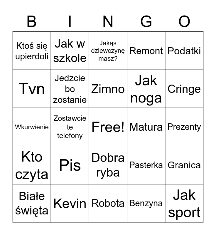 This bingo card has a free space and 24 words: Białe święta, Pis, Zimno, Benzyna, Podatki, Ktoś się upierdoli, Jak w szkole, Jakąs dziewczynę masz?, Matura, Prezenty, Wkurwienie, Jedzcie bo zostanie, Pasterka, Granica, Tvn, Kevin, Robota, Remont, Cringe, Kto czyta, Zostawcie te telefony, Dobra ryba, Jak noga and Jak sport.
