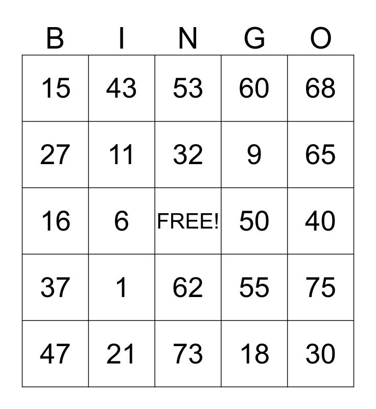 This bingo card has a free space and 24 words: 1, 21, 32, 47, 68, 15, 27, 43, 50, 62, 9, 16, 55, 75, 11, 18, 40, 53, 65, 6, 30, 37, 60 and 73.